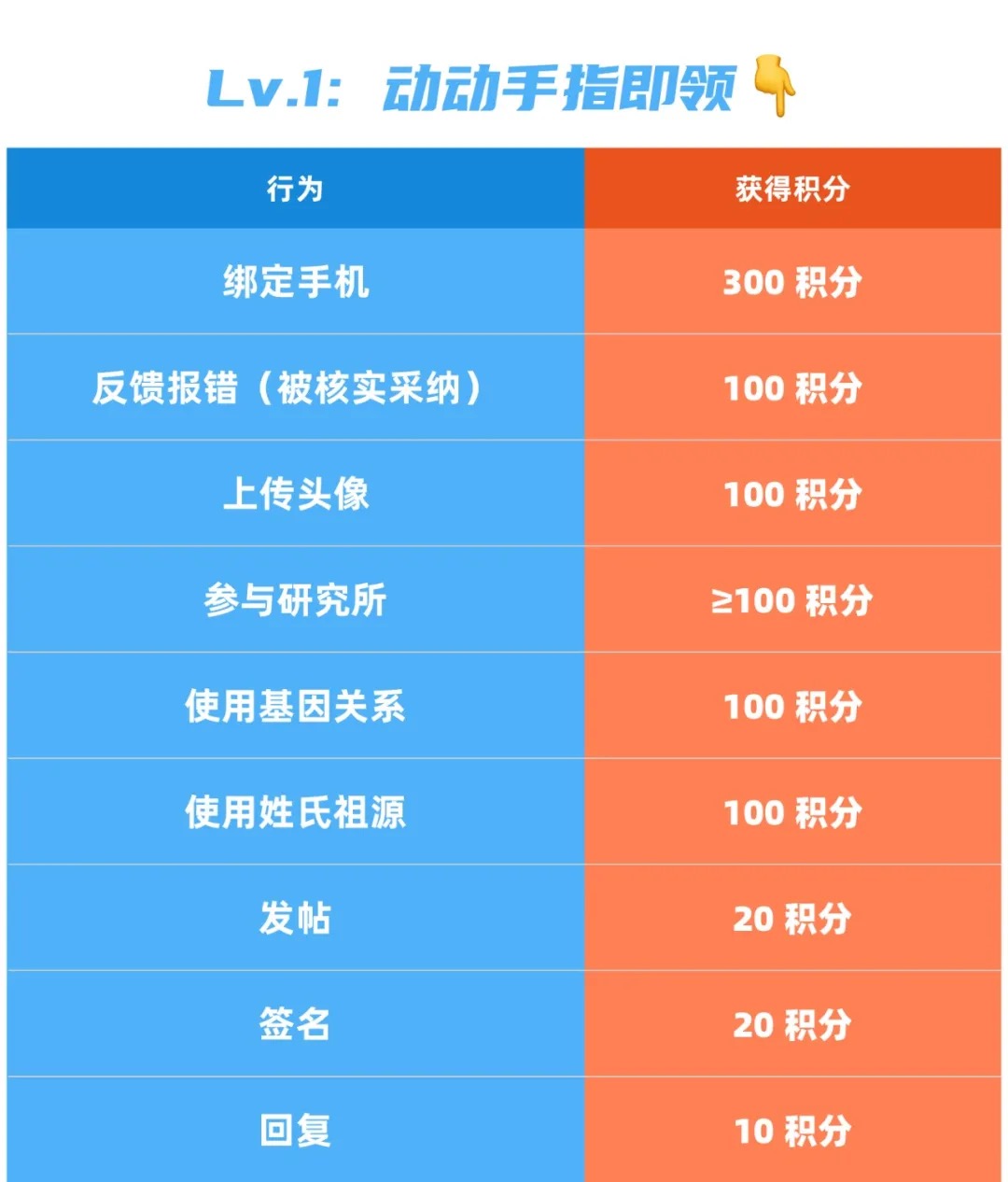 此外,以下表格里的许多行为,在微基因 App/官网的用户设置界面即可一条龙完成,轻松入手数百积分~