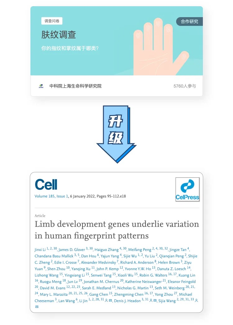 还有些成果,甚至登上了国际顶刊——2022 年初,汪思佳老师团队、金力院士团队的指纹花纹研究成果,发表在 Cell 主刊新年第一期上,我们微基因有幸也是参与该重磅研究的单位之一: