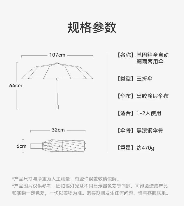 它收起来的伞长只有 32cm,符合便携需要;但升级加大的伞面,展开却有 107cm 的直径,比常规伞面加宽 15cm,适合 1-2 人使用~
