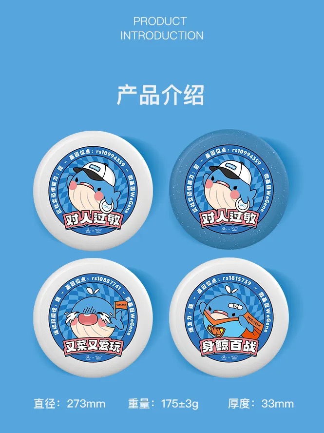 既然要追求刺激,那就贯彻到底咯~我们和国内专业的极限飞盘品牌翼鲲 YIKUN DISCS,推出了基因鲸系列——比赛/训练用标准成人极限飞盘,一共 4 种图案~