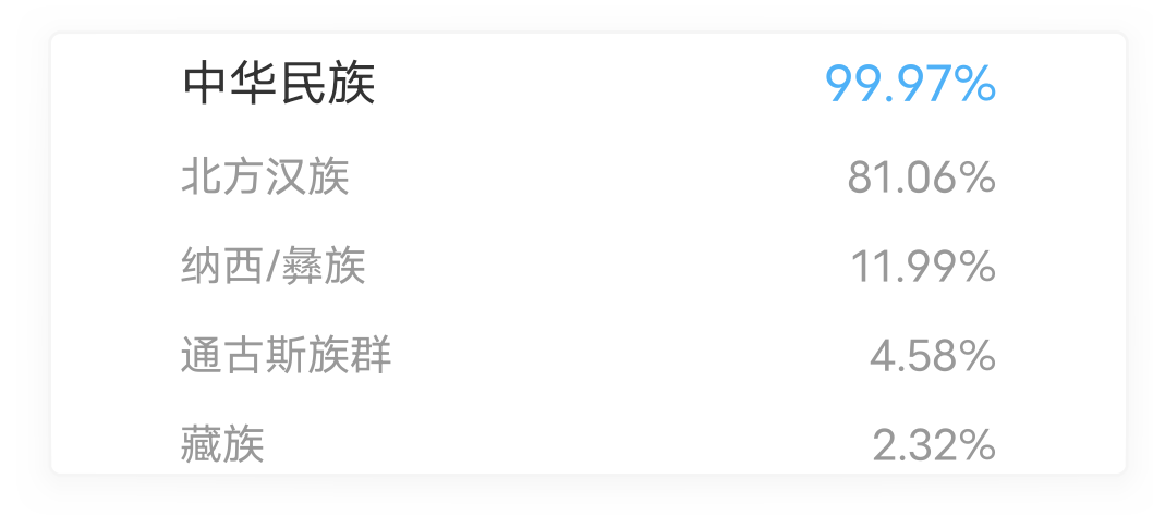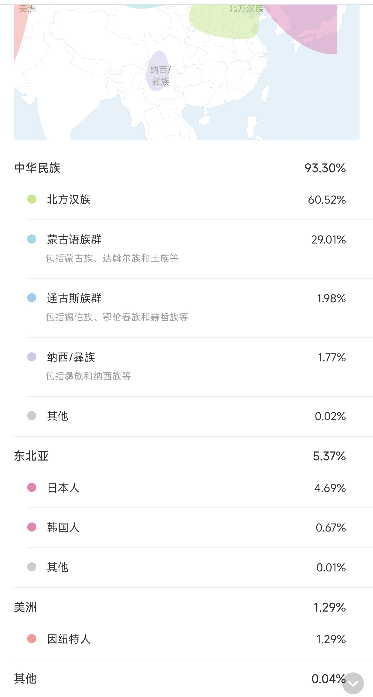 {"result":[{"race_desc":"\u4e2d\u534e\u6c11\u65cf","race_en":"chinese_nation","race_probality":"0.924652","area":[{"block":"chinese_nation","race_desc":"\u5317\u65b9\u6c49\u65cf","race_en":"han_northern","race_probality":"0.632748"},{"block":"chinese_nation","race_desc":"\u8499\u53e4\u8bed\u65cf\u7fa4","race_en":"mongolian","race_probality":"0.291804"},{"block":"chinese_nation","race_desc":"\u5176\u4ed6","race_en":"other","race_probality":"0.0001"}]},{"race_desc":"\u4e1c\u5317\u4e9a","race_en":"ne_asian","race_probality":"0.075078","area":[{"block":"ne_asian","race_desc":"\u65e5\u672c","race_en":"japanese","race_probality":"0.070276"},{"block":"ne_asian","race_desc":"\u97e9\u56fd","race_en":"korean","race_probality":"0.004792"},{"block":"ne_asian","race_desc":"\u5176\u4ed6","race_en":"other","race_probality":"0.0001"}]},{"race_desc":"\u5176\u4ed6","race_en":"other","race_probality":"0.0004","area":[]}],"case_id":"ANCESTRY","prefix":null,"description":"\u7956\u6e90\u5206\u6790","color":null,"detail_url":"\/report2\/ancestry\/"}