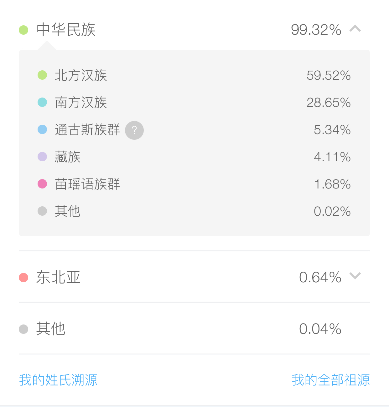 我是百分之74的北方汉族 20多的南方汉族有其它少数民族。