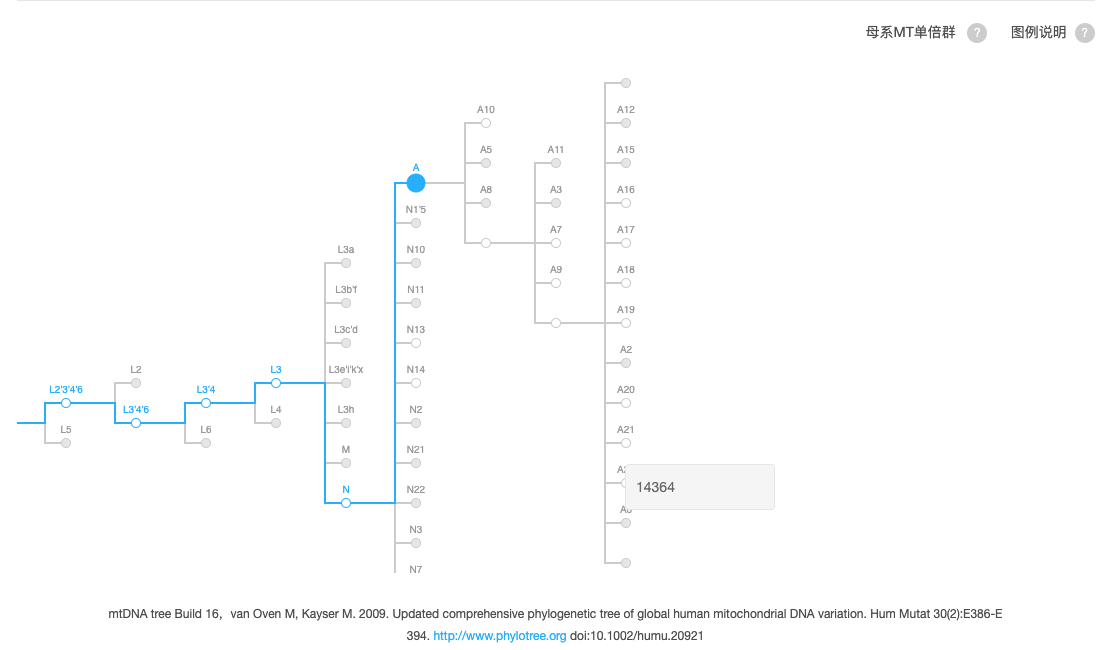 MT14364的A由G突变而来,A碱基用来辨识母系单倍群A21(引用:http://www.phylotree.org/tree/A.htm)